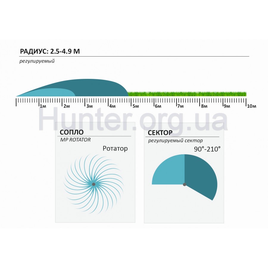 - Всі моделі насадки MP Rotator дозволяють легко відрегулювати радіус на величину до 25%, в той же час підтримуючи точну автоматичну швидкість поливу. Повертайте регулювальний гвинт насадки за годинниковою стрілкою, щоб зменшити радіус, або проти годинникової стрілки, щоб збільшити радіус. Щоб задати максимальний радіус, потрібно повернути насадку на чотири повних оберти. Додаткові оберти не вплинуть на продуктивність насадки. Для зручності налаштування використовуйте ключ для налаштування ротаторів Hunter MP Tool;